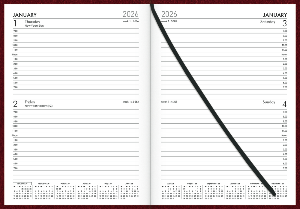 The 2026 Whitcoulls A52 two days-per-page diary in red is size A5 includes appointment times on pages and features an extensive information section. Diary is adhesive bound and has PVC coated paper cover.