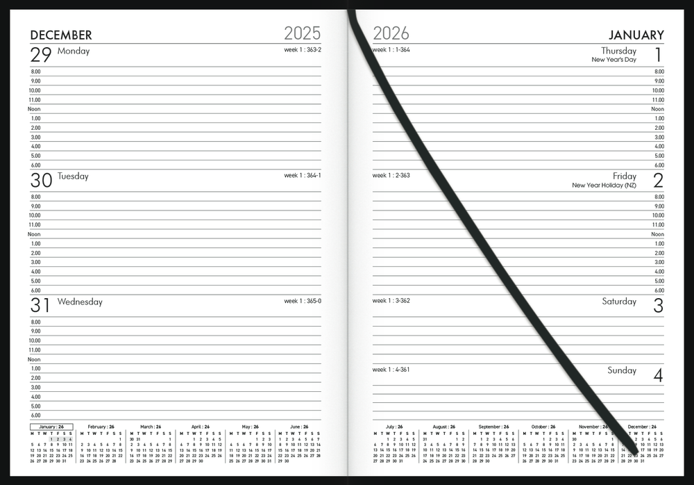 The 2026 Whitcoulls A53 week-to-view diary in black is size A5 includes appointment times on pages and features an extensive information section. Diary is adhesive bound and has PVC coated paper cover.