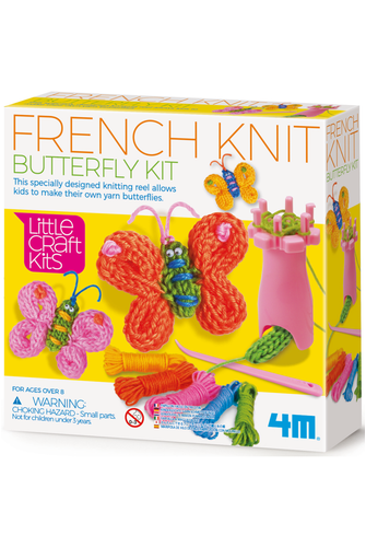 Stimulate imagination and creativity with the 4M Easy-To-Do French Knitting Yarn Butterfly Kit. Knit yarn butterflies for a fun art project with this easy-to-use kit. A specially designed knitting reel makes the kit easy for kids to use alone or with the help of an adult. Makes a fun introduction to knitting and contains materials for 3 yarn butterflies including yarn and google eyes.