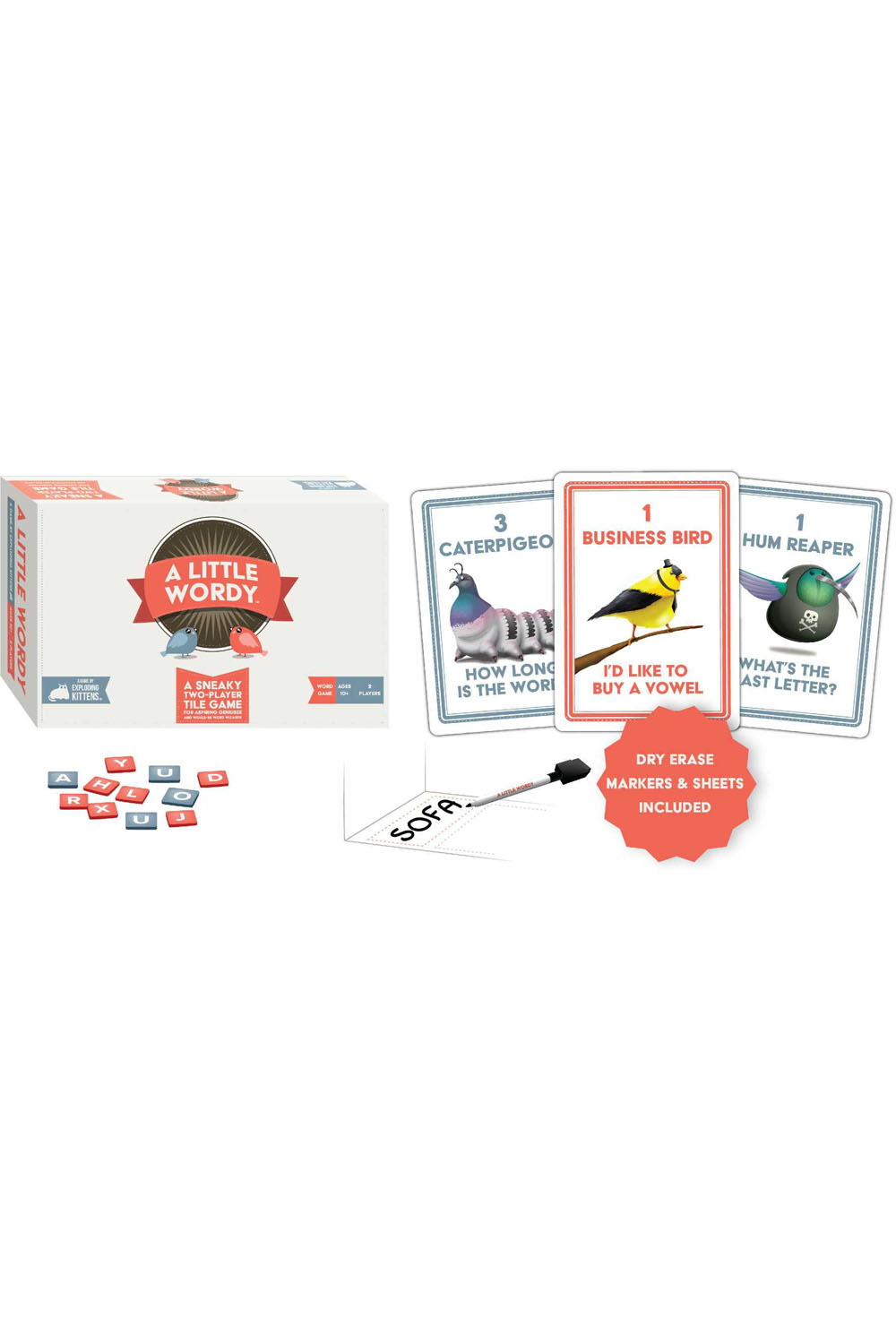 A sneaky two player tile-unscrambling game for aspiring geniuses and would-be word wizards From the award-winning, best-selling creators of Exploding Kittens and Throw Throw Burrito, A Little Wordy is a fresh and clever take on the genre of tile-based word games. Instead of just being another version of "who has the biggest vocabulary?" A Little Wordy requires players to assemble a word from a set of tiles and keep that Secret Word to themselves. Each player then takes turns trying to decipher each other's Secret Word by paying for clues and hints. It's thoughtful, strategic, highly-replayable, and built specifically for two players. It's not a game about having the mightiest vocabulary - it's a game about making clever choices