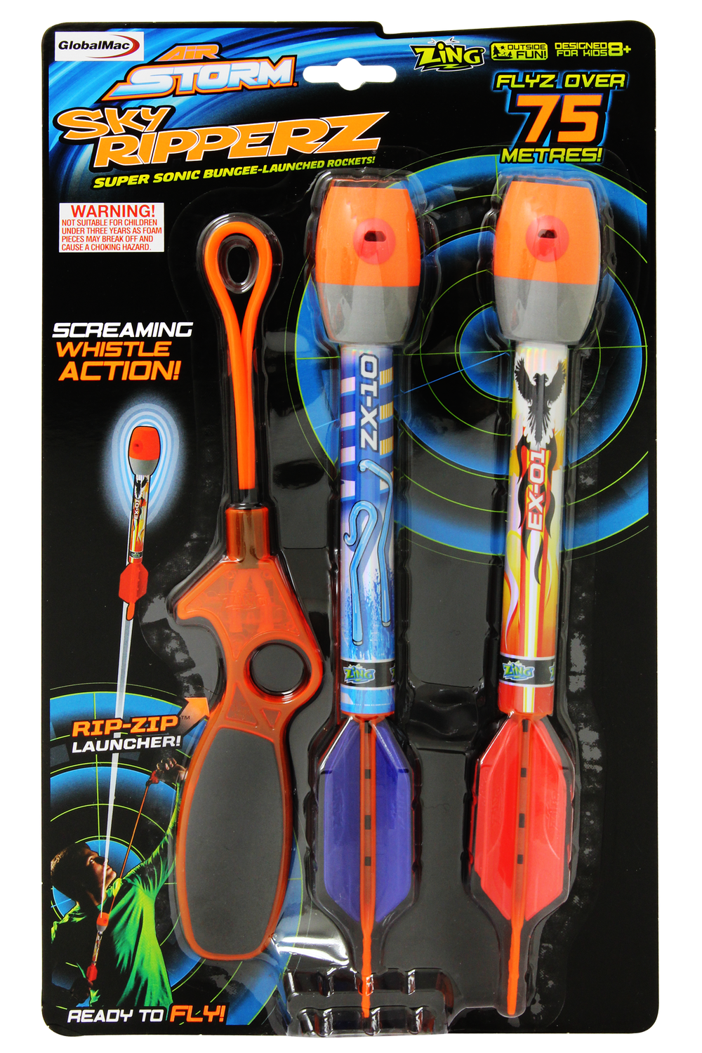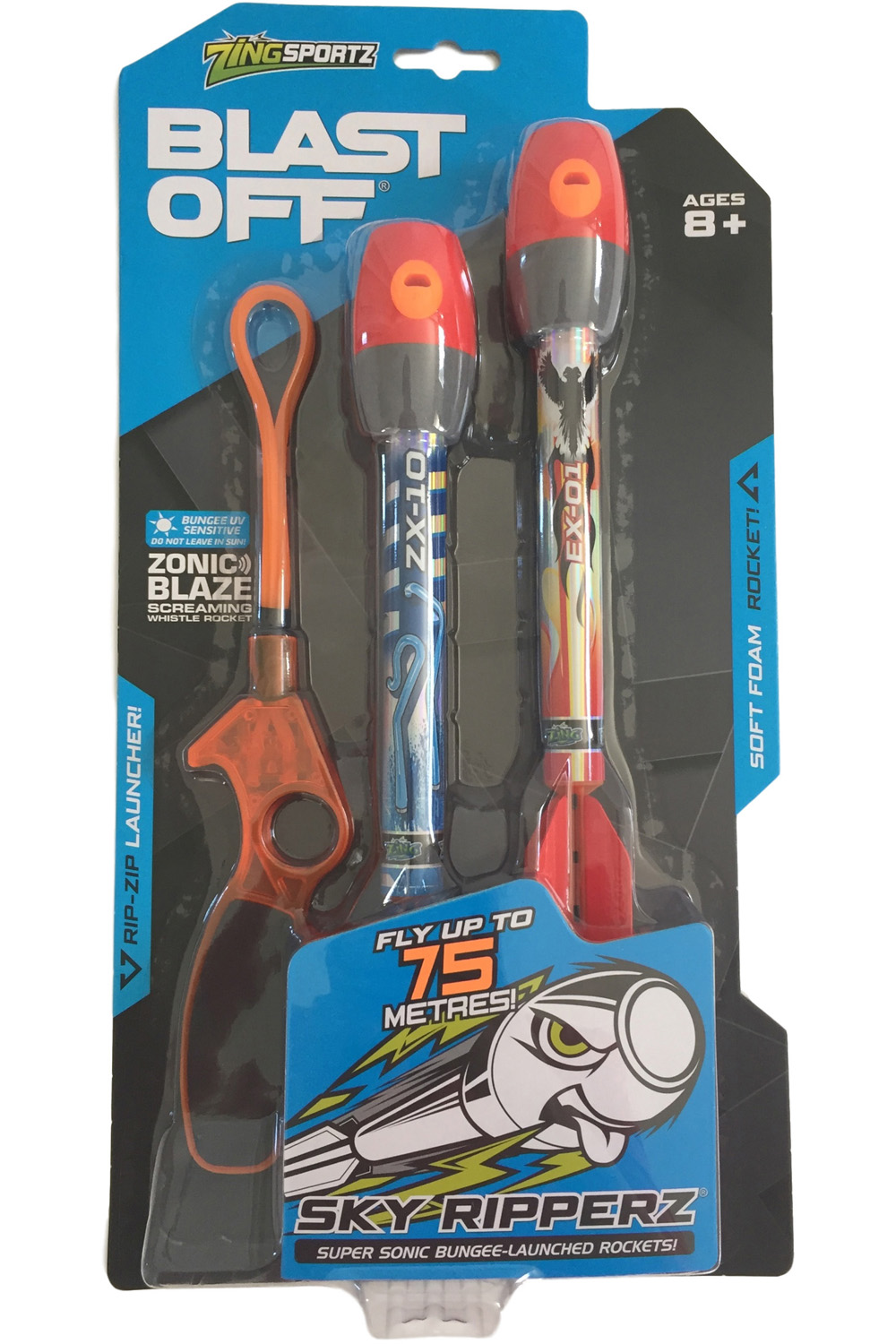 Air Storm Sky Ripperz are super sonic, bungee launched screaming rockets! With incredible aerodynamics, kids can send these rockets soaring over 75 metres! That's as tall as a 20 story building, or almost the length of a football field. Just attach your rocket to the bungee launch loop, let 'em rip and listen as the rocket howls through the air! Packaging and contents may vary.