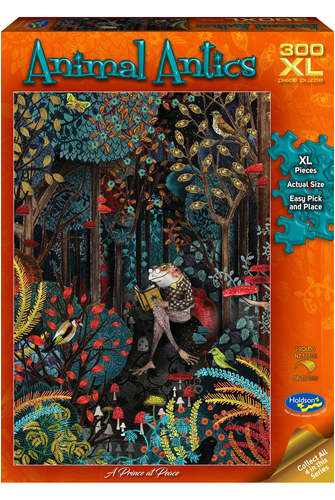Piece together a stunning and colourful image of a frog sitting in a forest, studiously reading a book while surrounded by birds and mushrooms, in this Animal Antics jigsaw puzzle with 300 XL pieces. Collect all in the series: A Prince At Peace, New Year, Stealing Away, The Breeze Dragon. Finished puzzle measures: 34.3cm x 49.8cm.