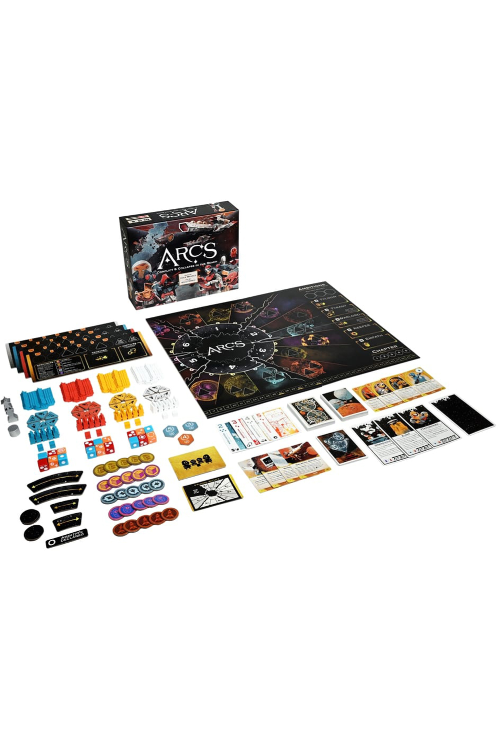 Arcs is a sharp sci-fi strategy game for 2-4 players, set in a dark yet silly universe. Ready yourself for dramatic twists and turns as you launch into this galactic struggle. Seize the initiative. Take actions with multi-use cards. Copy the leader, pivot to new tactics, or take the initiative for the next round. Timing is everything. Declare ambitions. In each game, you define the objectives that everyone competes over to win. Crush your foes. Amass your navy for battle, plan your strategy with three kinds of dice, then roll them all at once to resolve the battle in a flash.