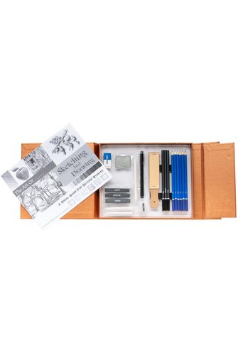 This creative Art Advantage Sketching Gift Box is the perfect gift or starter set for the budding new artist. This set includes: 6 sketching pencils (assorted grades), 3 charcoal pencils, 3 charcoal sticks, 2 tortillons, 1 blending stump, 1 sanding block, 1 fine tip marker # black, 1 plastic sharpener, 1 kneadable eraser, 1 eraser, 6 Sketching paper sheets