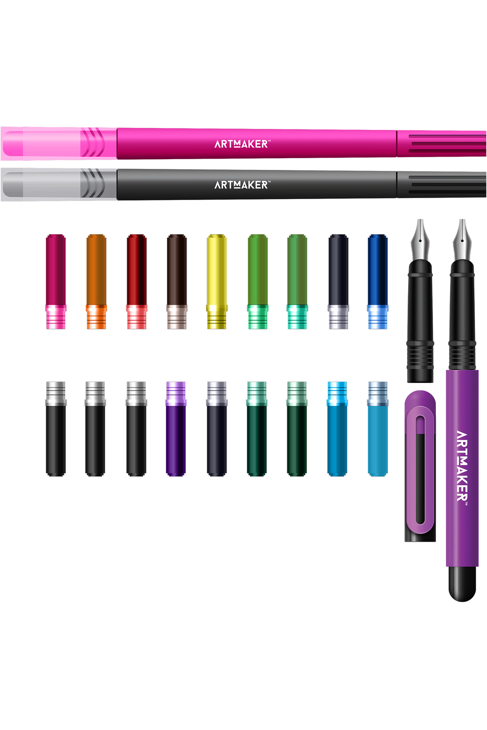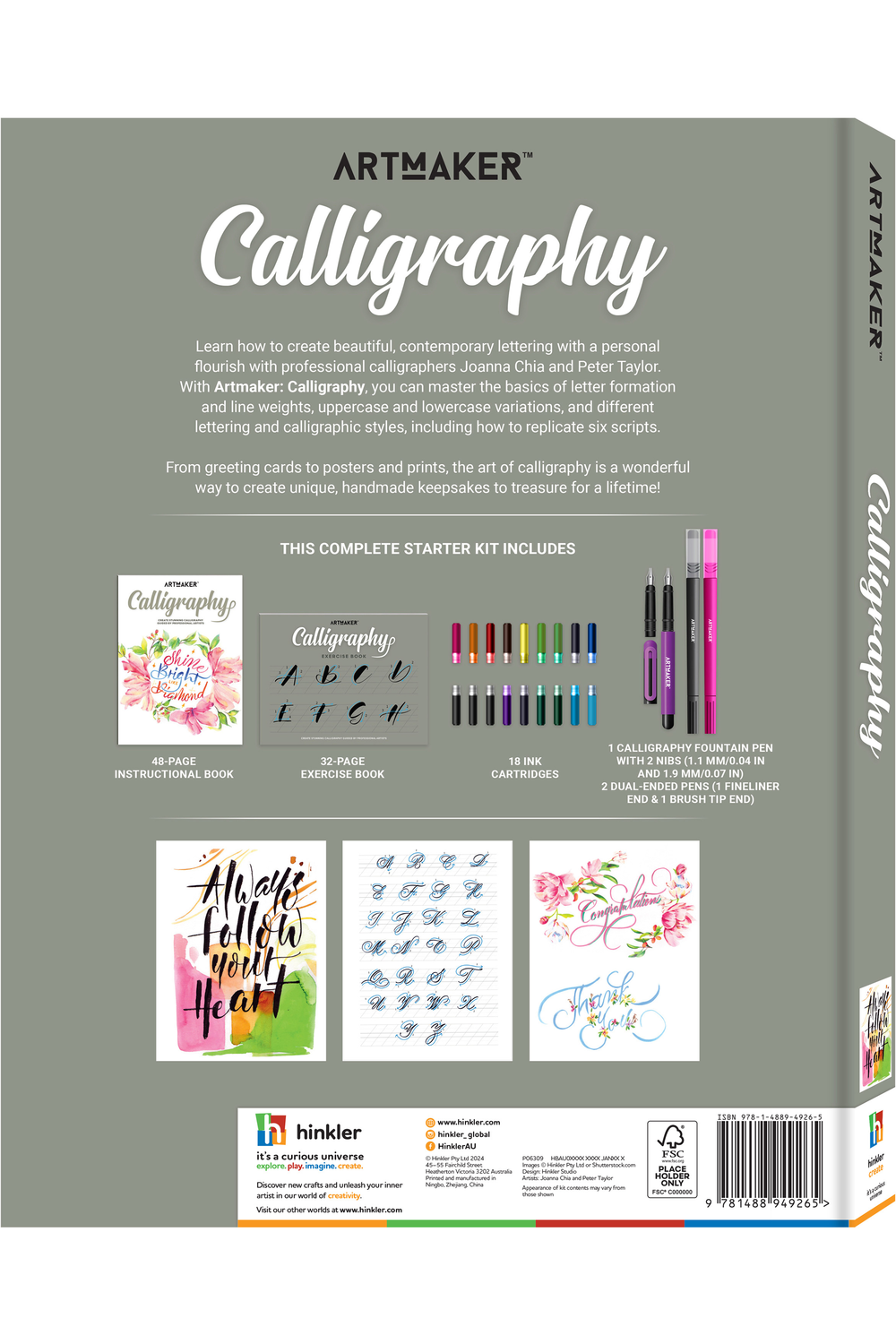 - Contents: 48-page instructional book + 1 exercise book + 1 calligraphy fountain pen, 2 nibs, 2 dual-tip pens, 18 ink catridges