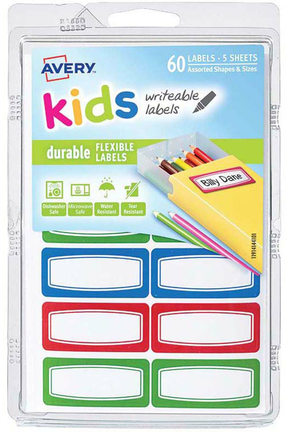Avery Kids Durable Flexible Labels Assorted Colours Pack of 60