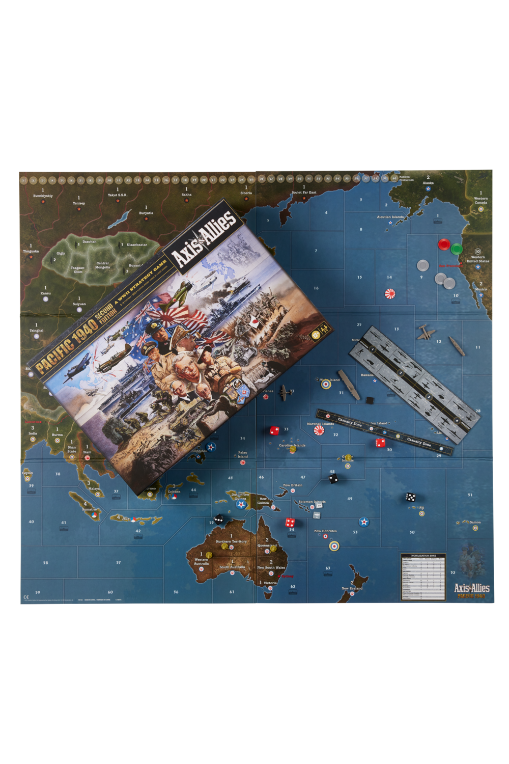 Decide the fate of a nation and the destiny of the world! The Avalon Hill Axis & Allies Pacific 1940 board game is a stand-alone game that can also combine with the Axis & Allies Europe 1940 game (Sold separately). It includes over 450 playing pieces, deluxe game components, local storage boxes, and an oversized board that measures 35" x 32". The game includes neutral countries that can be invaded, and mechanized infantry and tactical bombers are included. This World War II strategy game can be joined with Axis & Allies Europe 1940 (sold separately) to create a 6-player game on a map measuring 70" x 32" (178 x 81 cm). Game contains: gameboard, 5 national storage boxes, Battle Strip, Casualty Strip, 100 National control markers, 16 naval base markers, 16 air base markers, 16 industrial complex markers, 6 dice, 55 grey chips, 15 green chips, 10 red chips, 500 plastic miniatures, and instructions.
