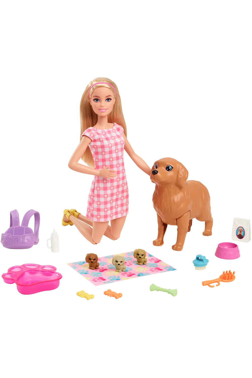 Surprise - Barbie doll's adorable pet dog has puppies on the way! With the Barbie Newborn Pups playset, kids can help Barbie doll deliver three adorable baby puppies when they press down on mommy dog's back. After welcoming the puppies, kids can fill the tub with ice-cold water, then dip the towel in and swipe it over the puppies to reveal a special birthmark on each. Barbie doll's flexible knees help her welcome her new pets, and with an adorable puppy carrier featuring room for all three pups, she can care for them on the go! Additional storytelling accessories include a bottle, two brushes, rope toy, two treats, a bag of dog food and a bowl. With so many nurturing accessories and storytelling opportunities, the Barbie Newborn Pups playset makes a great gift, especially for those who love animals!