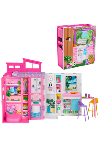 This cute, colourful, and foldable Barbie doll house inspires oodles of fun and countless getaway adventures! There are four play areas to spark storytelling - a kitchen, bathroom, loft bedroom and movie corner - as well as charming accessories for decorating. Kids can imagine so many sweet stories with the Barbie Getaway House! It comes with 4 play areas and 11 accessories for endless hours of fun. Decor accessories including assorted dishware, 2 chairs, a towel, and a blanket add realistic detail and all sorts of play possibilities. Graphics like recycling and compost bins, plants, solar panels on the roof, and an electric vehicle can help make kids aware of 'green' living habits! The doll house has a kitchen with a slide-out table, a bathroom, a lofted bedroom, and a cozy lounge for movie and game nights! Kids can collect a variety of Barbie dolls and pets to play out friendship stories in their house! Each sold separately, subject to availability.- Ages 3+