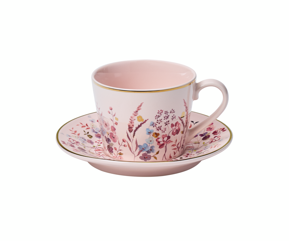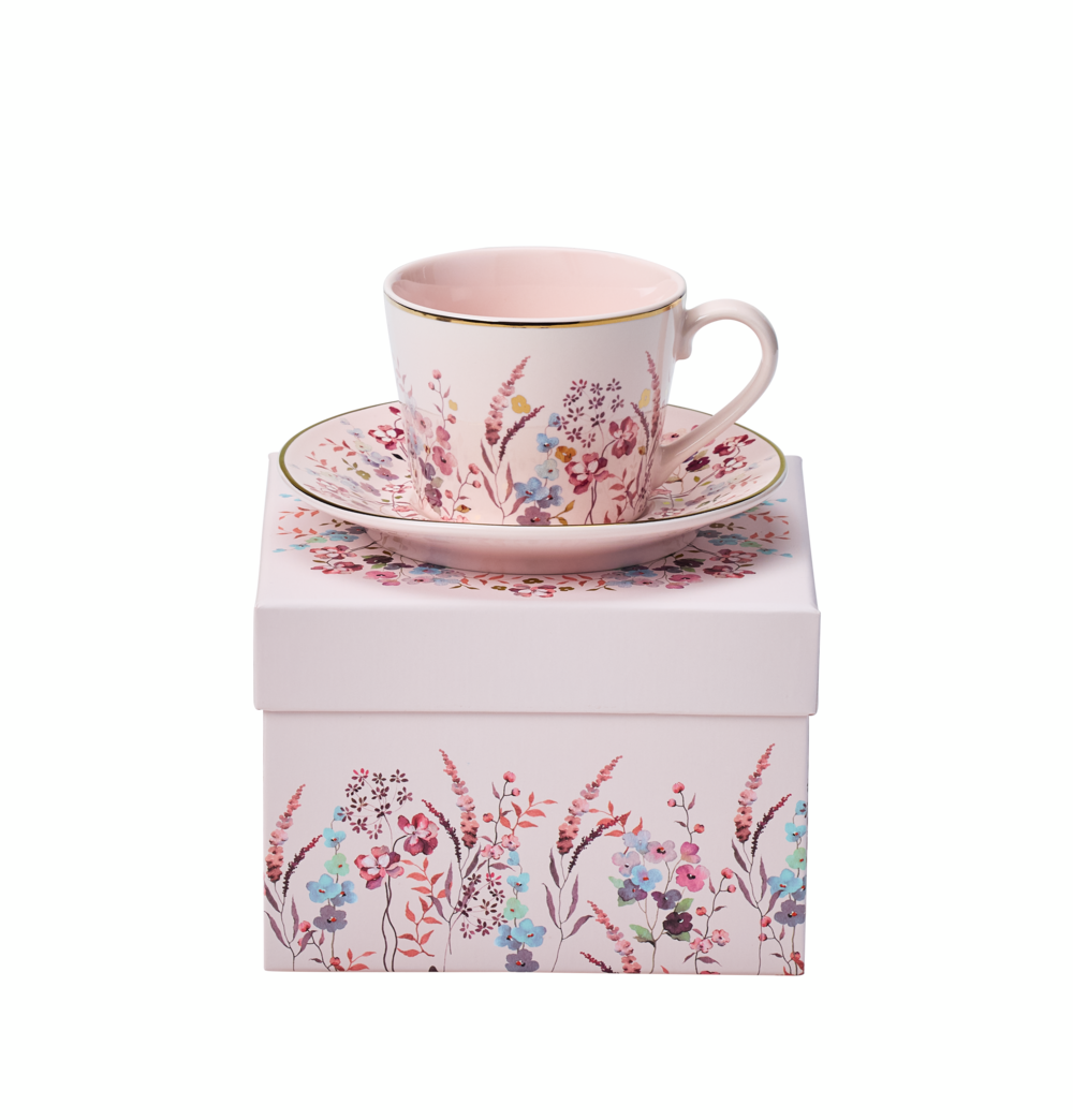 A tea cup and saucer set from the Belle range with beautiful floral illustrations with shiny gold accents on a pink base in a matching box for gifting and safekeeping. A beautiful gift for someone you care about or even just for yourself.