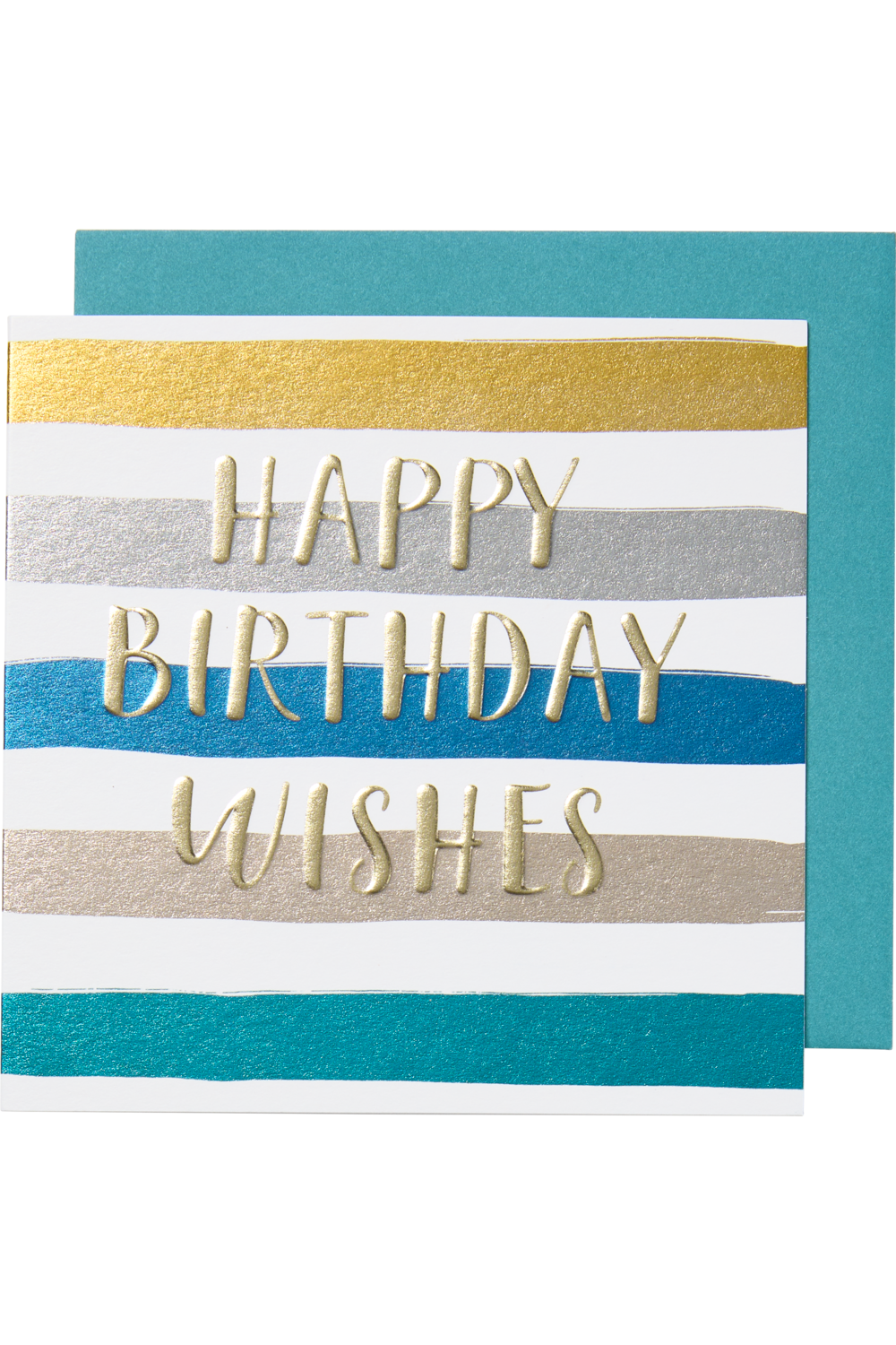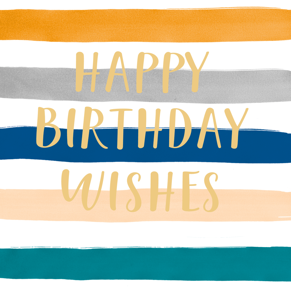 Wish someone a happy birthday with this modern card featuring the words "happy birthday wishes" on a white card with orange, grey, blue, peach, and cyan stripes.