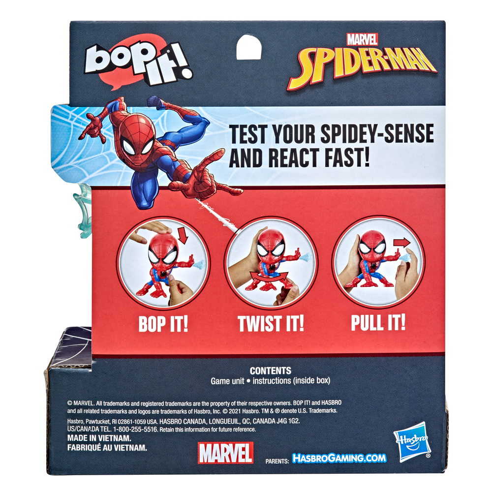 It's the popular Bop It! game that kids love with a Marvel Spider-Man twist. The Bop It! Marvel Spider-Man game unit is designed to look like Marvel's character Spider-Man. This electronic game commands players to take 3 actions in a random order, and they need to respond correctly and as quickly as possible. Players will be asked to pull Spidey's web, twist his legs, or bop his head - in different combinations. Each time a player responds correctly, the unit will call another command, and the commands keep getting faster and faster. Players will also hear some funny phrases in the voice of Spider-Man. The game unit features 2 modes: Solo and Pass-it, so kids can play the game alone or with friends.