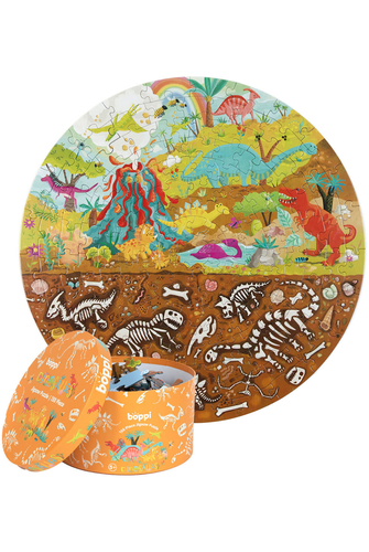Boppi 150 piece round jigsaw puzzles are made from 100% recycled card and offer a great gift idea for children 5 years and up. Each puzzle is presented in a colourfully illustrated round gift/storage box. This Dinosaur version captures the prehistoric world, complete with a volcano, dinosaur eggs, and fossils of T-rex, Diplodocus, Stegosaurus, Pteranodon, Parasaurolophus, and Triceratops. Made with durable 3 layered puzzle pieces with a coated finish and hard backing, making them suitable for little fingers. Puzzle diameter: 58cm