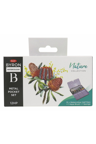The Jasart Byron Watercolour Metal Pocket Nature paint set is ideal for aspiring watercolour painters, students and hobbyists who want excellent quality at an affordable price. Perfect for travelling or urban painting, the pocket-sized metal box features an integrated mixing palette in the easy to open and close lid, so artists can travel light on their painting expeditions! The set contains twelve high quality watercolour half pans in assorted colours that are fully intermixable allowing you to create a huge colour palette! The included aqua brush features a barrel handle to carry water and activate the paint pans, and the sponge included in the set can be used to dab excess water or paint onto and for cleaning the aqua brush.