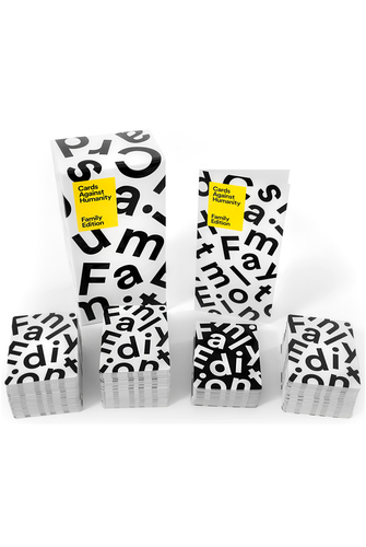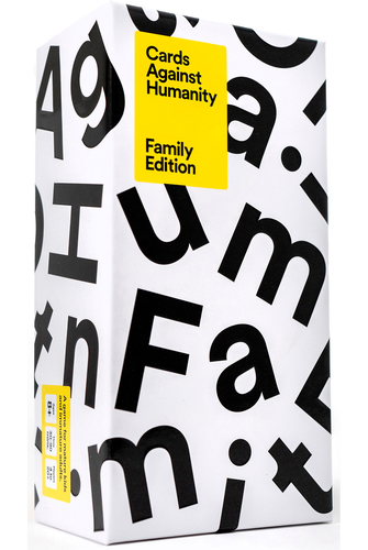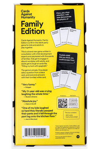 Cards Against Humanity Family Edition is a fill-in-the blank party game for kids and adults to play together! This is a brand new game written in consultation with child development experts and play tested with thousands of families. Kids get to engage in absurd wordplay with adults, and adults get to laugh at cards like "Filling my butt with spaghetti." The game is simple. One player asks a question from a black card, and everyone answers with their funniest white card.