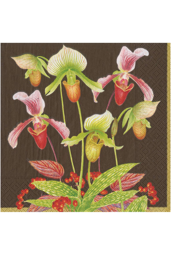 A pack of 20 3-ply lunch napkins featuring colourful slipper orchids on a brown background from Caspari. Caspari napkins are produced using environmentally sound raw materials and are printed with non-toxic, water soluble dyes.