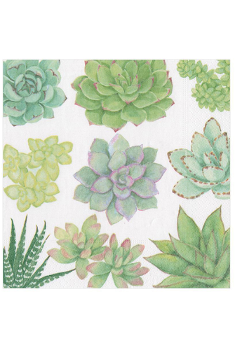 A pack of 20 3-ply lunch napkins featuring an assortment of lush succulents on a white background from Caspari. Caspari napkins are produced using environmentally sound raw materials and are printed with non-toxic, water soluble dyes.