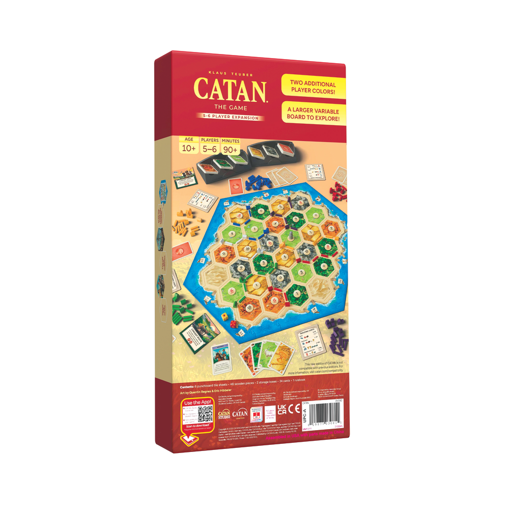 This is not a complete game! Requires CATAN Base Game 6th edition to play. The CATAN 5-6 Player expansion allows two more player to vie for control of the bountiful island of CATAN. Play has never been more nuanced regarding trading and building then when six players compete for valuable resources and prime building sites. Take your games of CATAN to the next level with the 5-6 Player expansion and leave no player behind! Adds 11 new unique terrain tiles. You can now play with 5 or 6 players! Adds depth and complexity to your games of CATAN. This is an expansion. A copy of the following is required to play: CATAN. The previous and current editions of CATAN can be used together. Certain product combinations have distinct card backs, which can be resolved by purchasing CATAN-sized card sleeves or replacement cards. Some accessories may not be compatible across editions due to changes in component size or design.