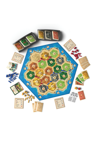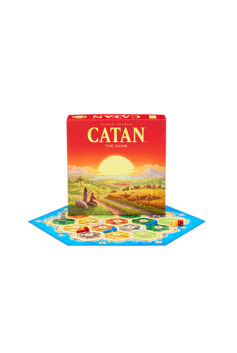 Welcome to the unexplored island of Catan! As you and your fellow explorers gaze across the uninhabited landscape of hexagonal tracts of terrain, you quickly realize that this unique land arrangement provides ample space for each of you to put down roots. You race off to establish your respective communities by gathering resources from nearby terrain, building your infrastructure, and nurturing trade relationships. Watch out for surprises! Your rivals can block your path or send the robber to plunder your wealth!