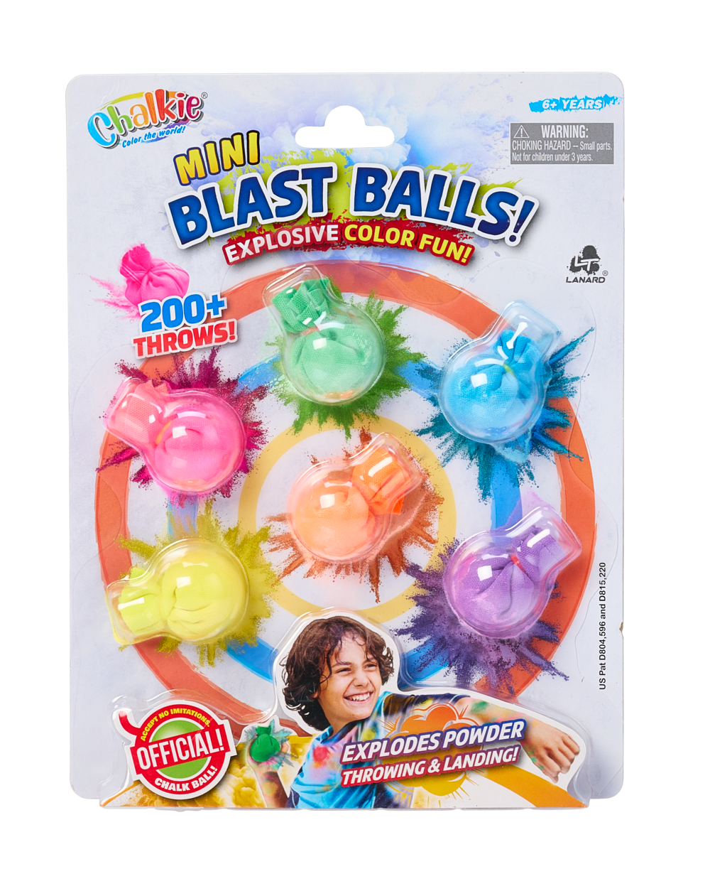 The original patented Chalkie chalk blast balls! These unique and innovative rainbow-coloured Chalkie chalk blast balls are great for outdoor fun and friendly competition! It is the perfect gift and game for birthday or holiday parties, backyard adventures and any outdoor gathering, a great way to show off your creativity. Train up your skills to create art with every toss! The set includes 6 assorted colored chalk blast balls. You can make over 200 throws per chalk blast ball! Coloured chalk powder is washable and safe.