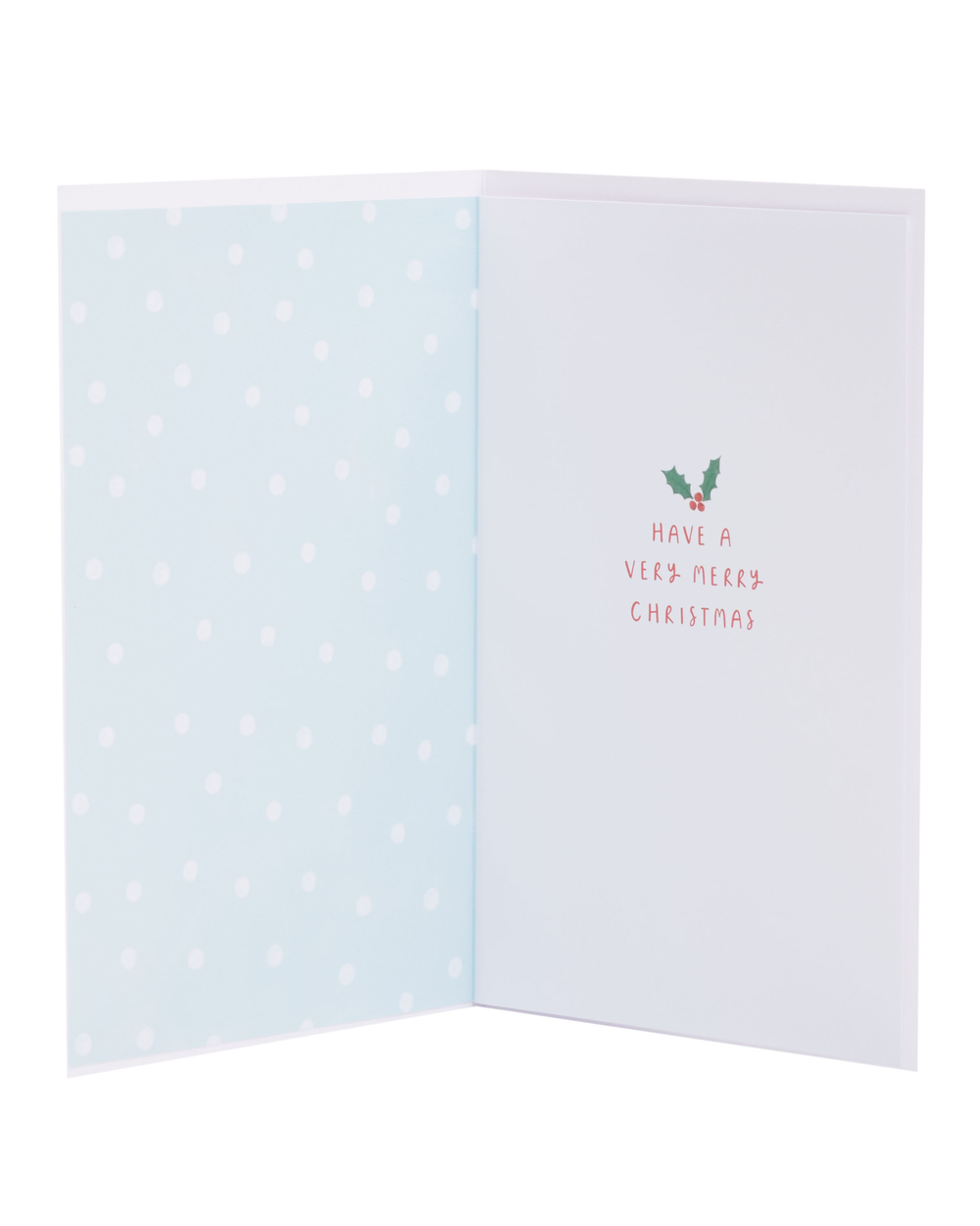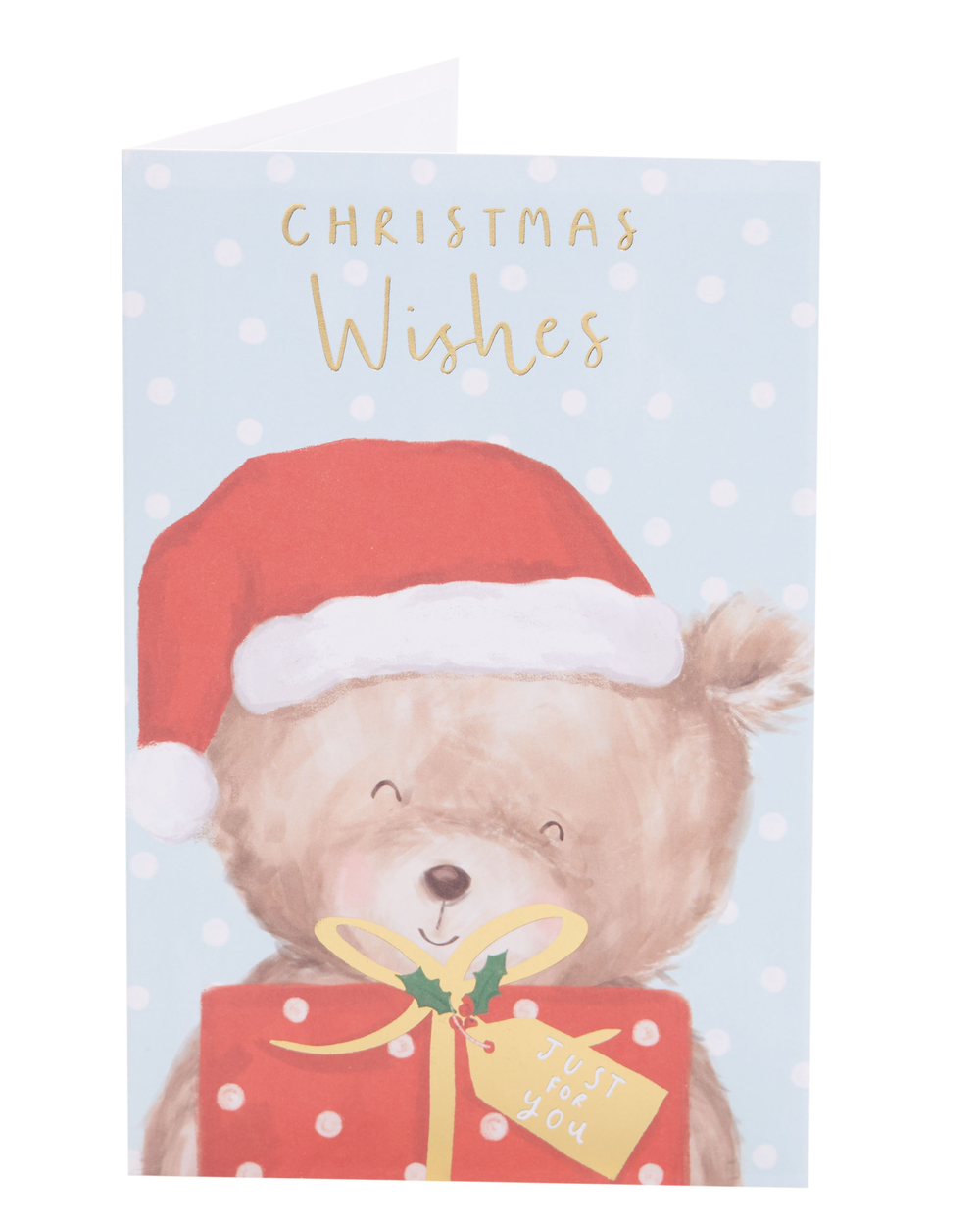 Send them Christmas wishes with this cute card, featuring a teddy bear in a Santa hat, carrying a gift, and finished with gold foil. Message Reads: Christmas Wishes. Just for You. Have a very merry Christmas