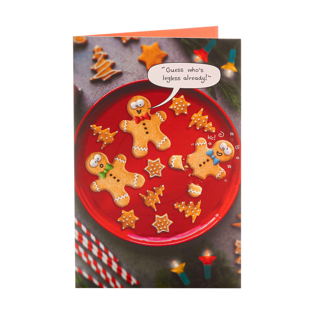 Make them laugh with this funny Christmas card, featuring a 'legless' gingerbread man in a bowl of punch! Message Reads: "Guess who's legless already!" Merry Christmas!