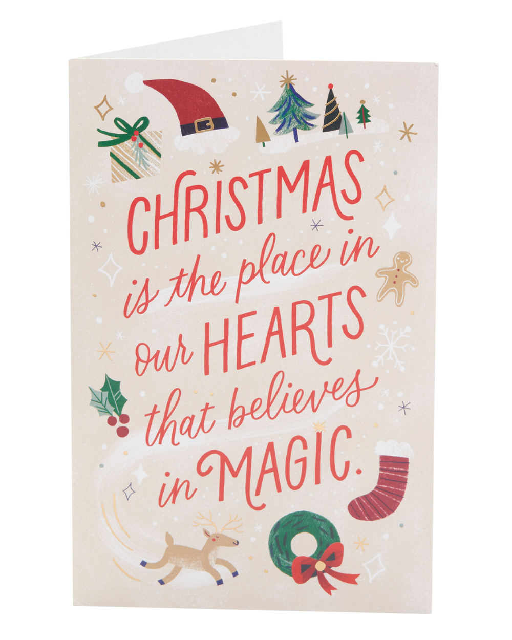 Wish them all their Christmas wishes come true with this magical card, printed on premium quality board with touches of gold foil. Message Reads: Christmas is the place in our hearts that believes in magic. Hope your biggest and brightest wishes come true this Christmas.