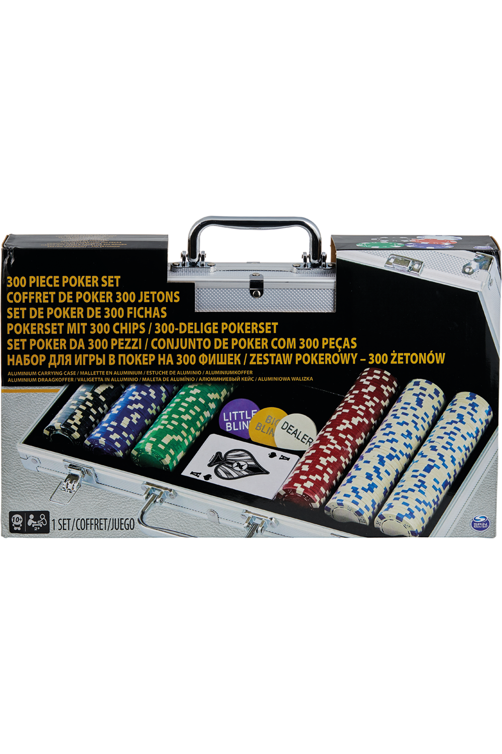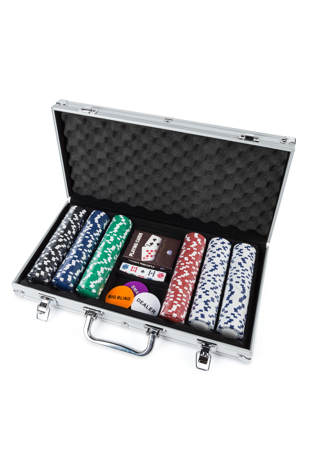 - Contents: 300 casino-style chips, Sturdy aluminium carry case, One deck of poker cards, dealer chips, instructions