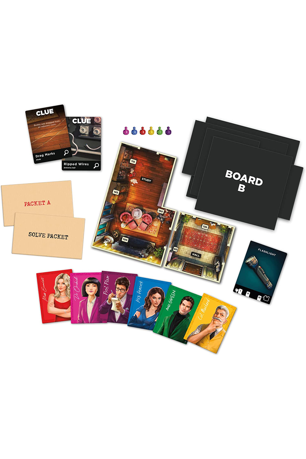 Clue Treachery at Tudor Mansion offers the suspense and intrigue of the classic murder mystery game, Clue, in a dynamic escape room board game. You're a guest at Mr. Boddy's mansion when suddenly you hear a shriek, the lights go out, and you find Mr. Boddy dead! You and fellow players are then put to the ultimate test: Work together to escape the mansion, then determine who killed Mr. Boddy, where, and with which weapon. The Clue Treachery at Tudor Mansion Escape & Solve Mystery board game offers classic Clue characters and story in an escape room game that lets players play right away with limited setup. Players move their pawns around a gameboard that's built room-by-room as they explore the mansion, draw cards, solve puzzles, unlock new rooms, and uncover clues. After escaping the mansion, players review the clues they've collected and use deduction to make a correct accusation and win! Gather friends and family together for a game night they won't forget as they immerse themselves in a cinematic, single-play experience.