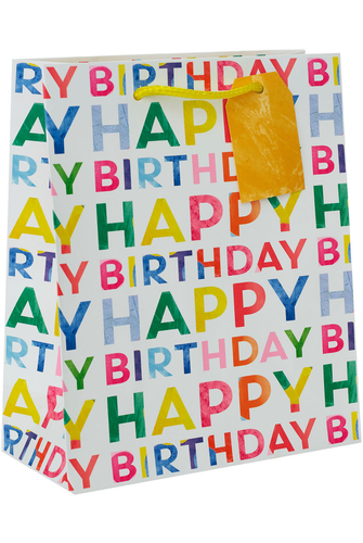 Give a gift in style with this medium sized gift bag, featuring a white bag and the words "HAPPY BIRTHDAY" written over and over again with colourful letters, and a tag to write a short message to your loved one.- Packaging Dimensions: 19.6cm x 23.5cm