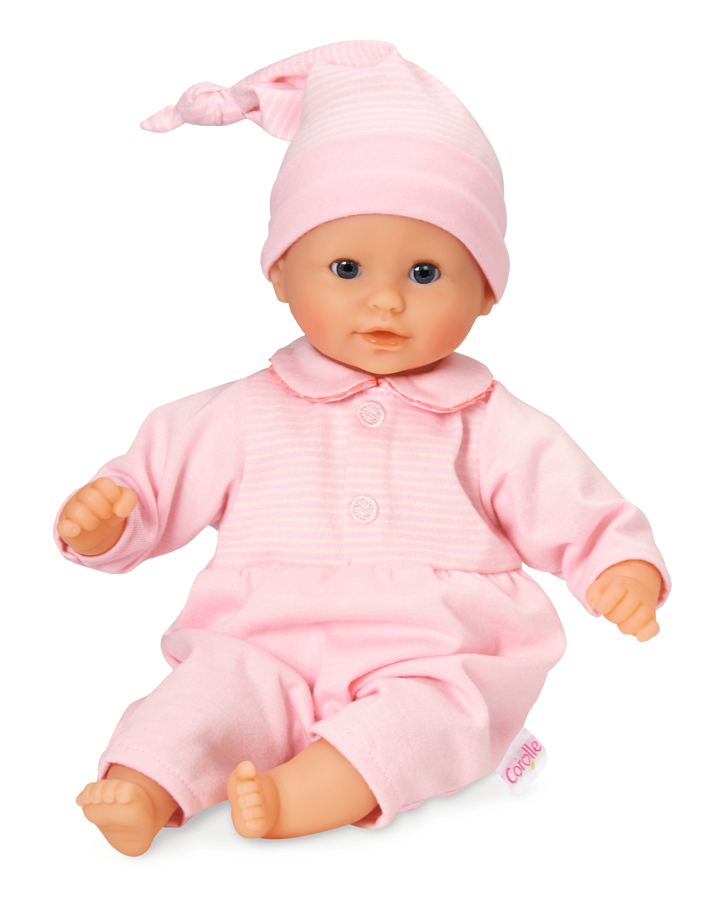 Calin Charming is the perfect 'my first baby doll' for a child to cuddle. This adorable blue eyed 12-inch baby doll has a bead-filled body that allows children to pose her just like a real baby! Dressed in a pink fuzzy 1-piece outfit and sleep hat, this doll has a beanie body and a soft vanilla scent for added delight.