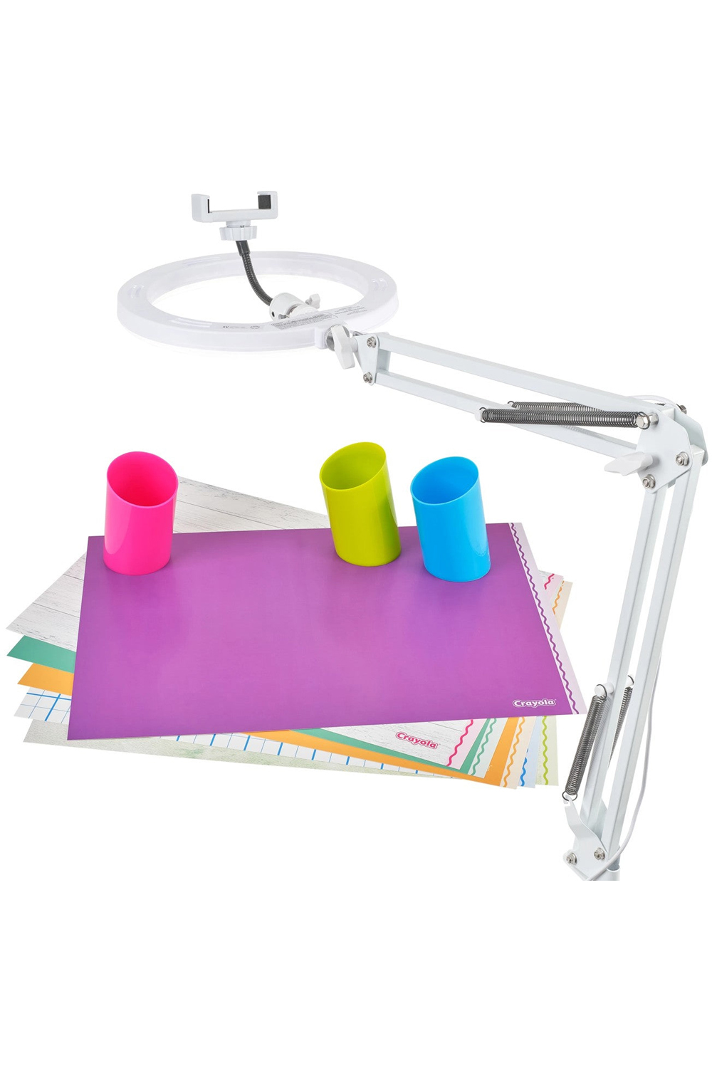 Only available in-store, not available online. Get creative with the Crayola Creations Content Creator Tech Set. This comprehensive set includes everything your young one needs to make engaging content and show off their passion for creativity. With a variety of inventive accessories, they can easily produce eye-catching projects and share their artistic journey with friends and family. The set includes a 25cm ring light and camera mount allowing them to capture stunning photos and videos with perfect lighting. It also features 6 mats for vibrant backgrounds and 3 colourful caddies to store pencils, markers, and other art supplies. Designed to inspire creativity, this set empowers young creators to explore their imagination.