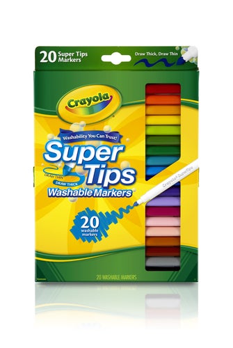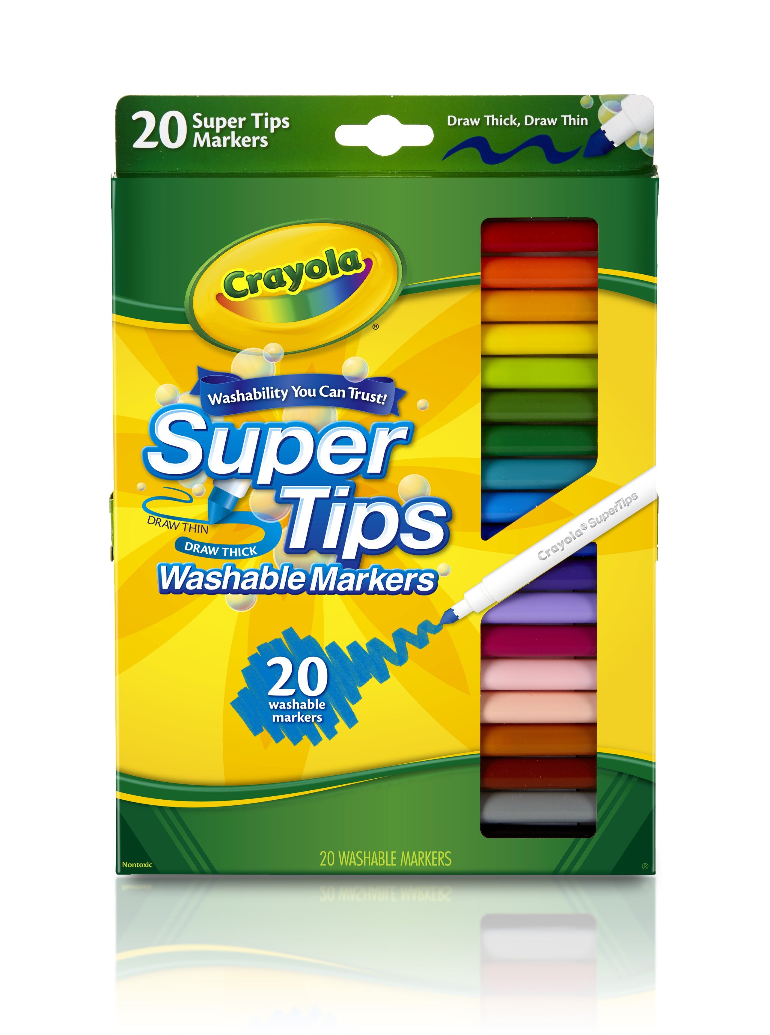Crayola Super Tips Markers have a unique, durable tip designed to draw two different line thicknesses. Use the tip for detail work and fine lines, and the side of the marker to smoothly colour large areas. Ideal for home or school projects. The markers have a washable ink formula and are non toxic. Each pack contains 20 bright, intense colours.
