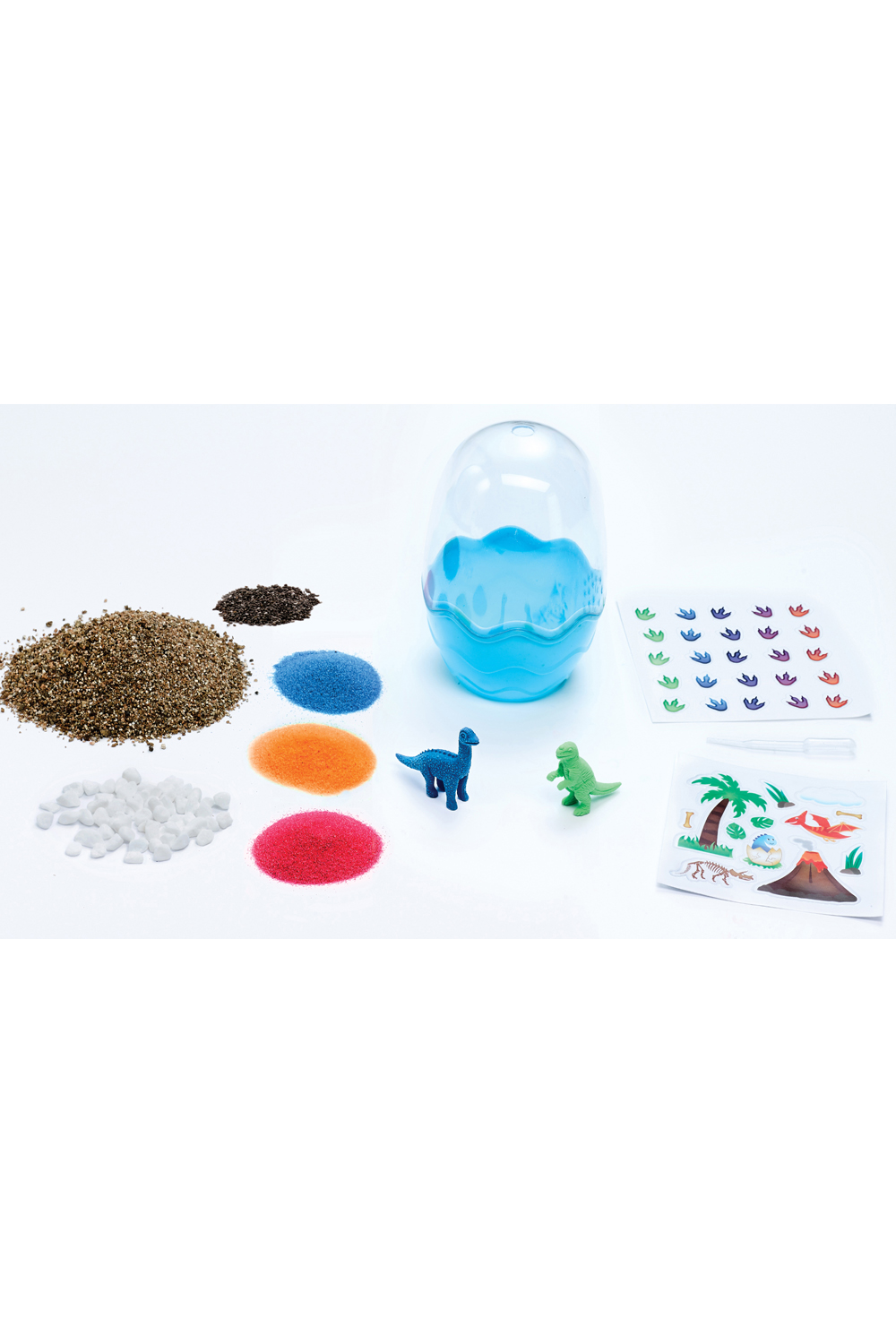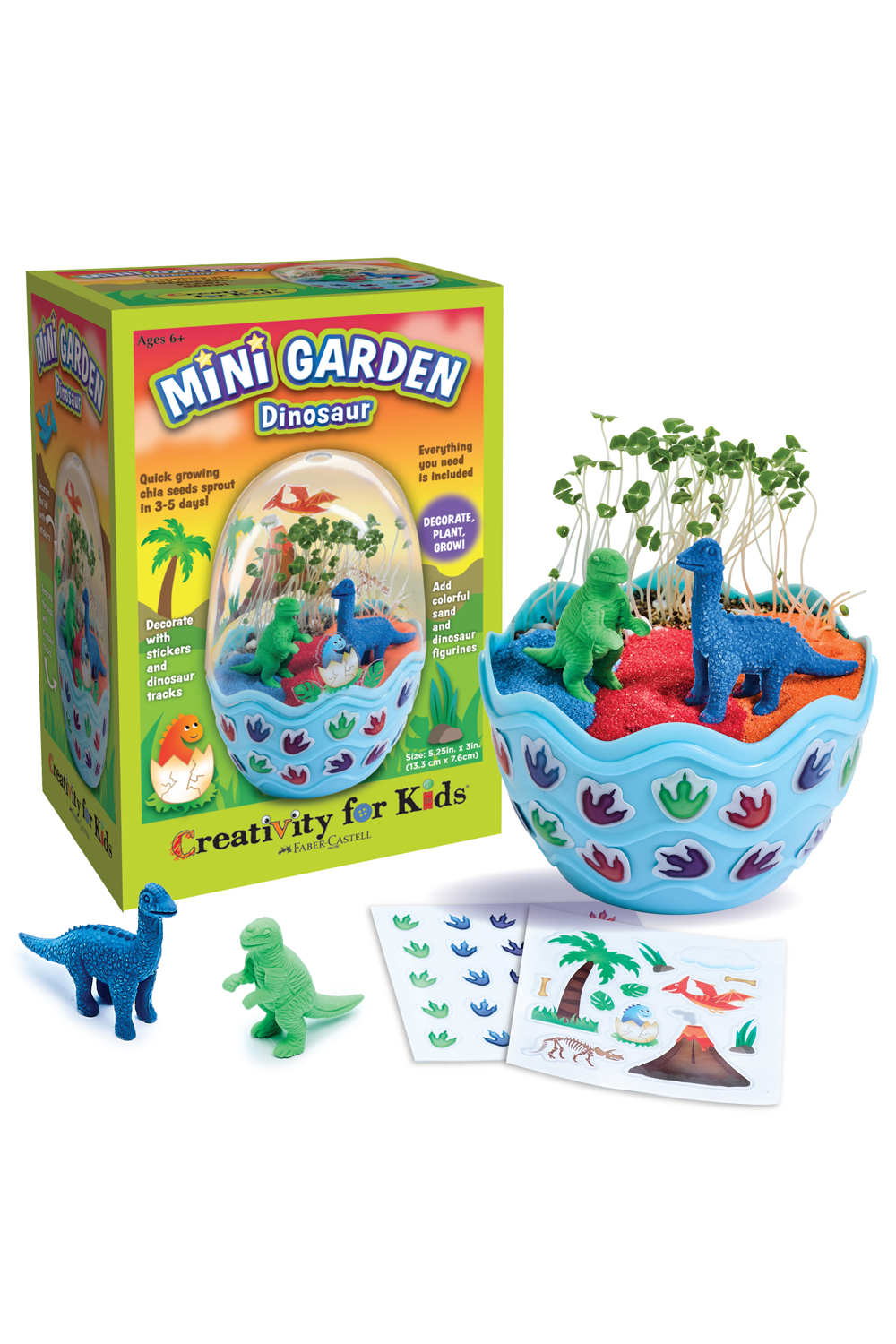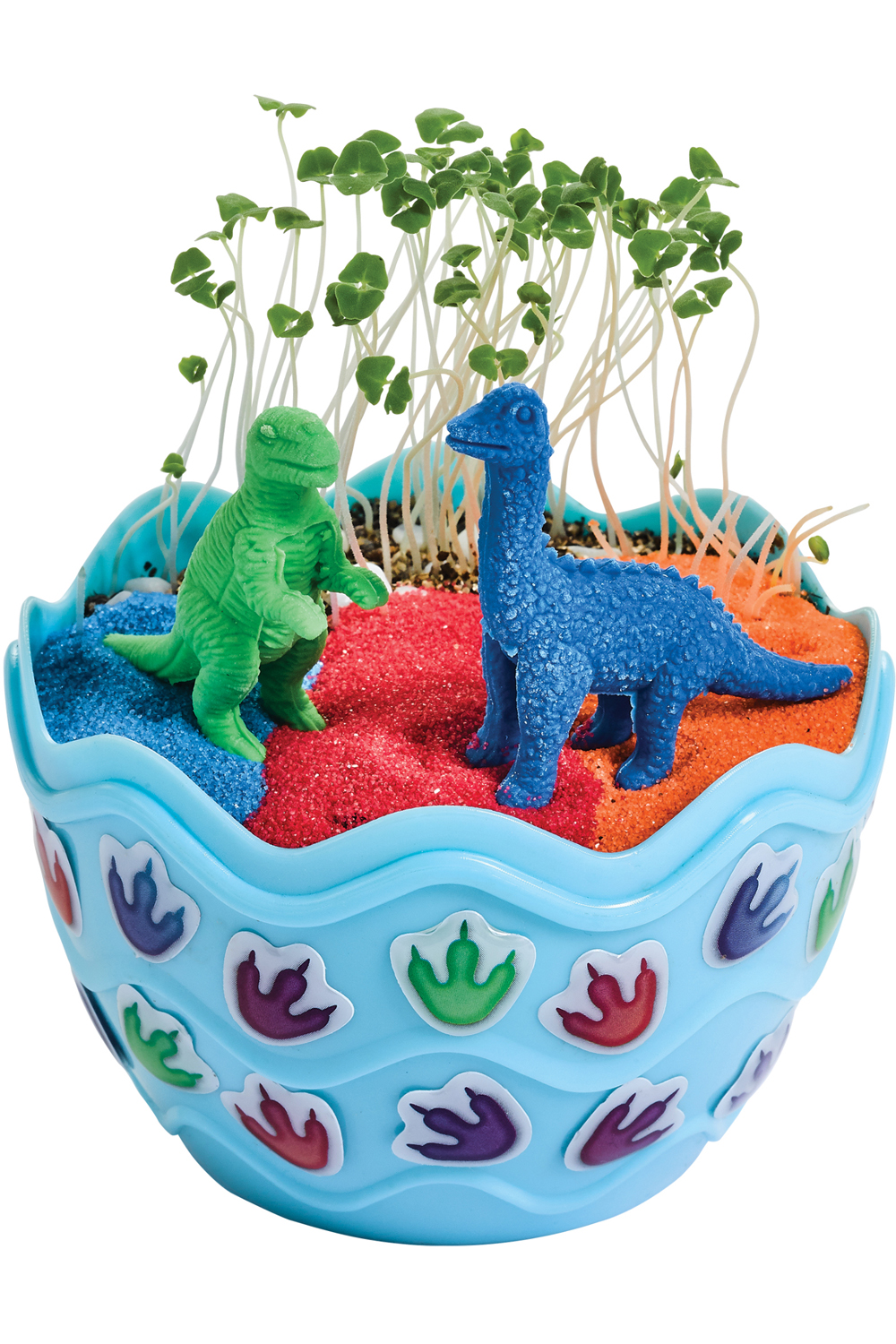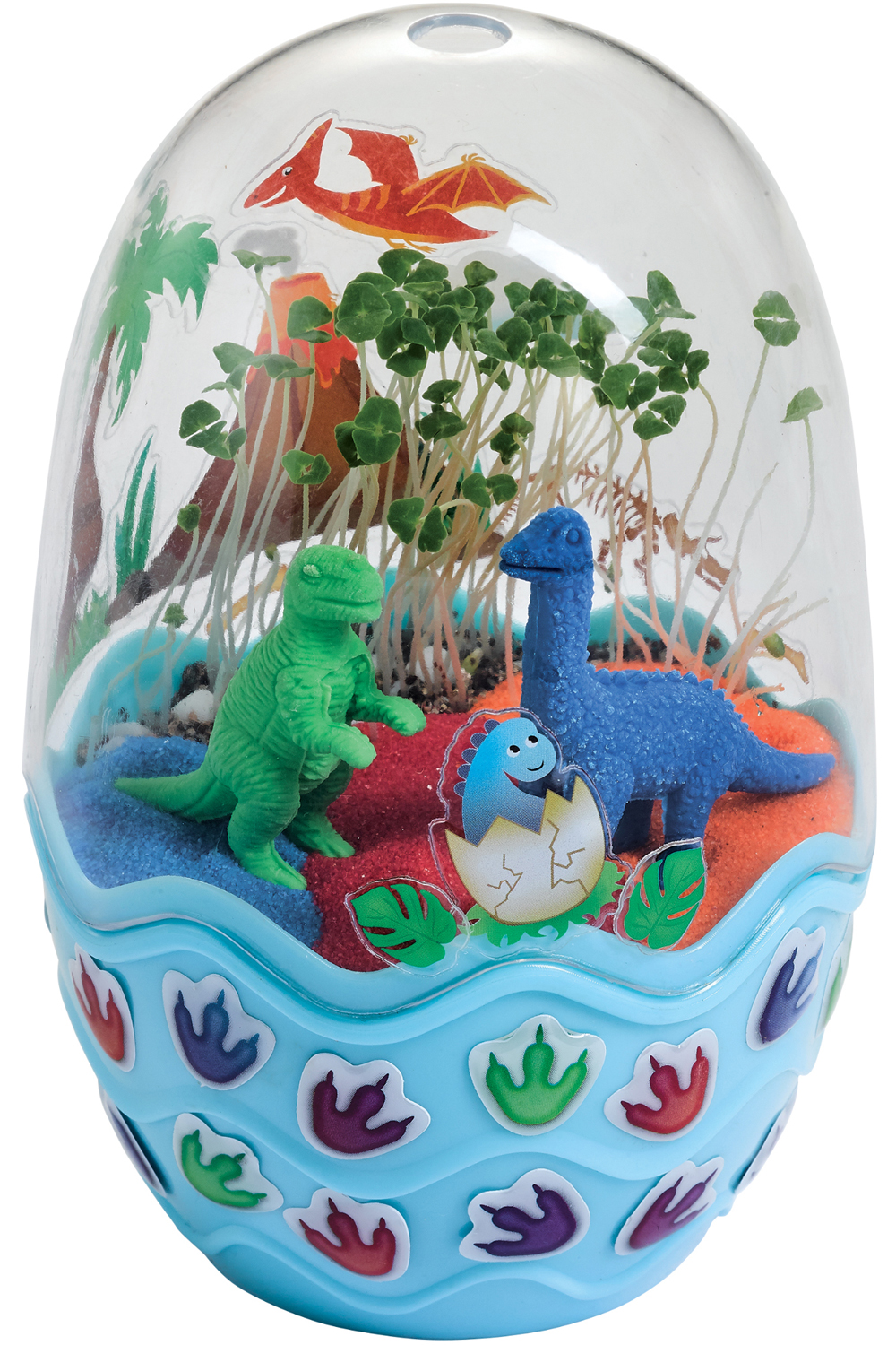 Decorate, plant and grow your own mini Dinosaur Garden in an egg-shaped mini environment. This kit comes complete with everything you need to grow your own mini garden, including potting mix, quick growing chia seeds, puffy stickers, transparent stickers, 2 tiny dinosaurs and decorative sand. The seeds will sprout in 3-5 days, giving the dinos a real garden to explore.