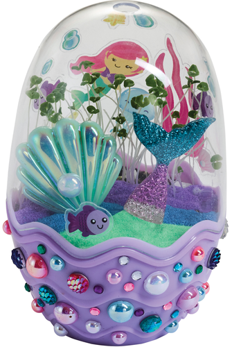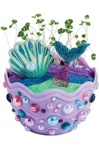 Decorate, plant and grow a mini mermaid terrarium! Quick growing seeds and under the sea accents bring your magical garden to life. Everything you need is included, just add imagination! Mermaid craft kit includes potting mix, quick growing chia seeds, themed stickers, dimensional accents, fun mini figures and decorative sand. Plant, water and place in direct sunlight to get amazing results! Included chia seeds sprout within 3-5 days of planting for immediate results and fun! Mix science and art for a fun unisex experience! Inspires creativity as gardeners personalize their mini magical garden with the mermaid themed stickers and pearl accents. The perfect gift for any mermaid lover! Growing your own mermaid garden is a fun arts and crafts activity for your child that develops nurturing skills, responsibility and creative confidence!- Ages 6+