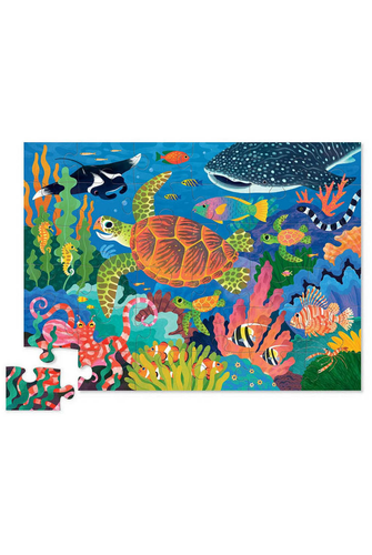 Venture into the deep with this beautifully illustrated ocean themed, foil stamped 36-piece floor puzzle. All wrapped up in its unique contour-shaped storage box, the jumbo, sturdy pieces of this high-quality puzzle are ideal for little hands. Puzzle and box grey board are made of up to 70% recycled post-consumer content.- Ages 3+