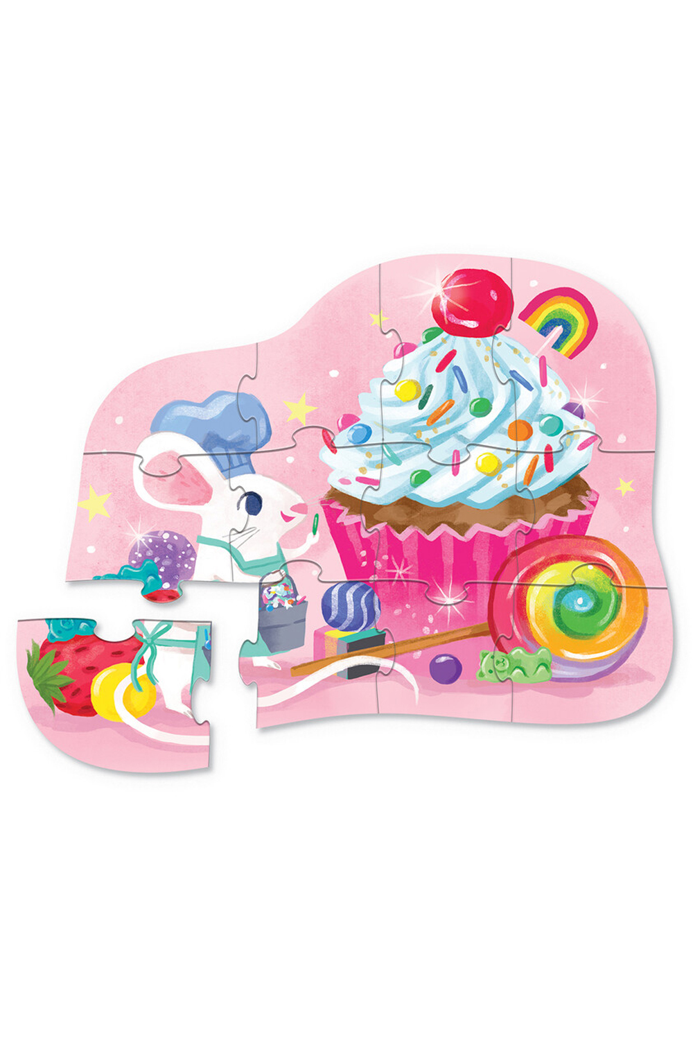 Enjoy this high-quality 12 piece children's jigsaw puzzle featuring a brightly coloured image of a white mouse in a chefs hat decorating a delicious cupcake. When completed, the puzzle measures 30.5cm x 22.8cm