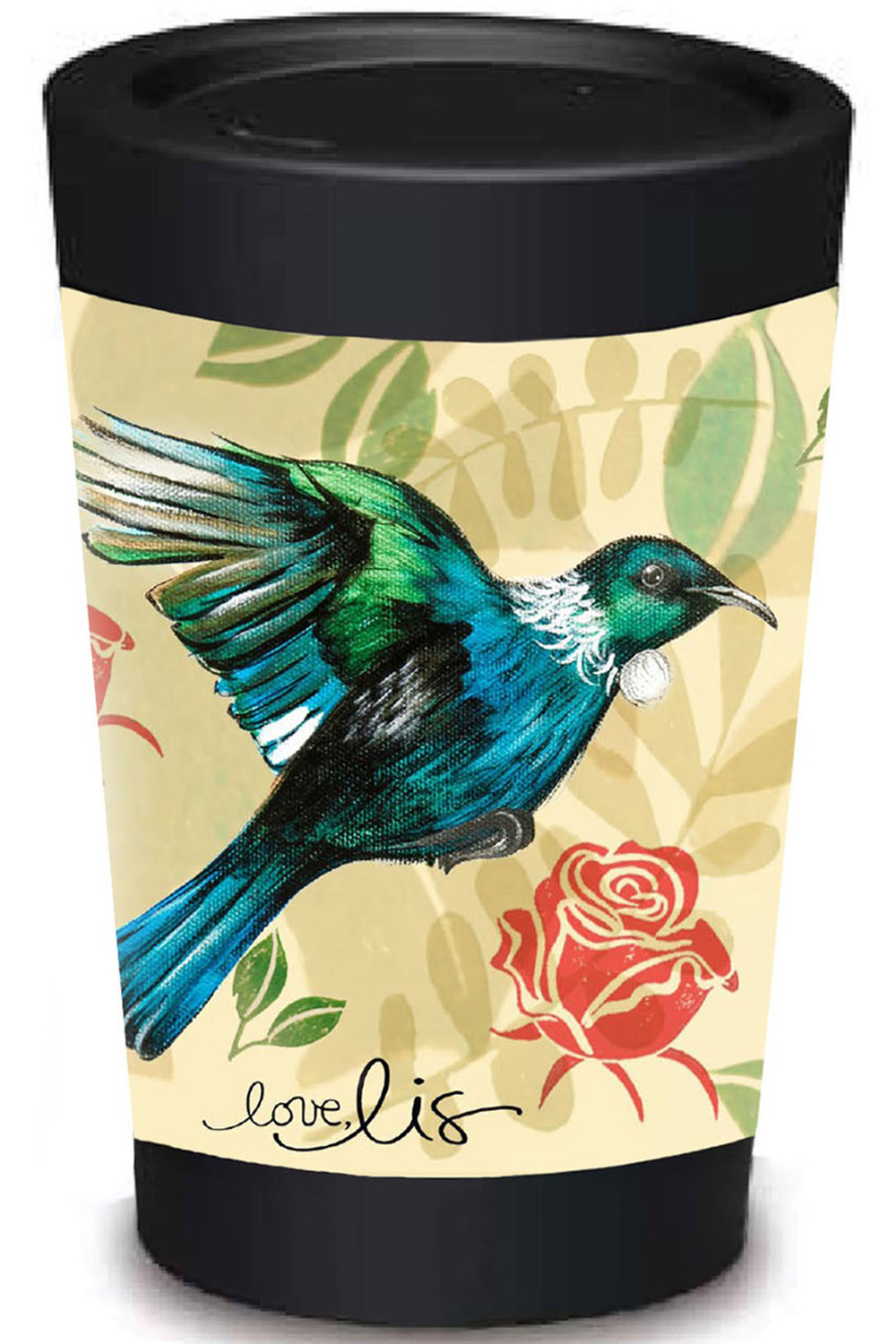 Have your fix and help to fix the planet with this 12oz CUPPACOFFEECUP takeaway mug featuring a tui illustration by Love Lis. CUPPACOFFEECUP is a New Zealand-made reusable takeaway coffee cup company. Instead of disposing of a cup every time you have a takeaway coffee, re-use your CUPPACOFFEECUP. The idea behind CUPPACOFFEECUP was to create a reusable cup that is lightweight, has striking full colour imagery and looks and feels much like a disposable cup. The cup is microwave safe with the lid off. Hand wash recommended. Not suitable for boiling liquids.