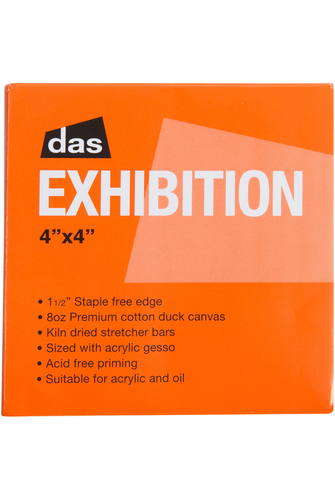 A 4X4" stretched DAS exhibition canvas manufactured using 100% natural long fibre cotton and kiln dried wood. This canvas features staple free edges and acid free priming, making it suitable for acrylic and oil paint.