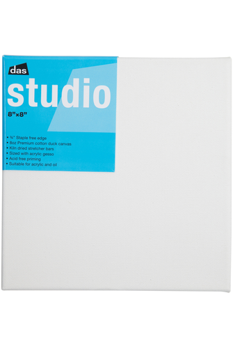 An 8X8" stretched DAS studio canvas manufactured using 100% natural long fibre cotton and kiln dried wood. This canvas features staple free edges and acid free priming, making it suitable for acrylic and oil paint.