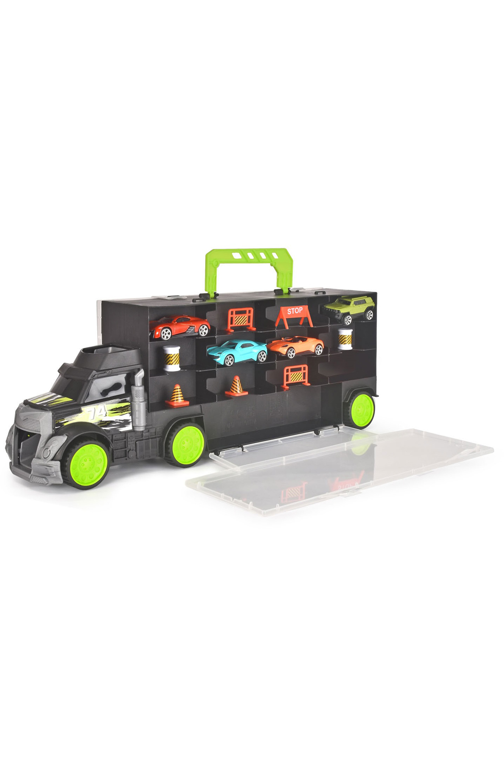 Young children are guaranteed to love the small metal cars. With the transporter, the toy cars can be stored neatly and transported to their next race in style. Thanks to the built-in handle, the transporter is also ideal for on-the-go use. The truck features storage compartments on both sides, which can store up to 28 cars. It also has transparent panels so that the cars remain in full view when the truck is not in use or placed on a shelf. The set includes four premium cars with a metal chassis, as well as a number of accessories (2x cones, 1x stop sign, 2x barriers, 2x barrels) that can be used to set up a small race course. Another highlight of the toy car transporter is the built-in ramp in the driver#s cabin, which can be used to launch the cars from the truck.