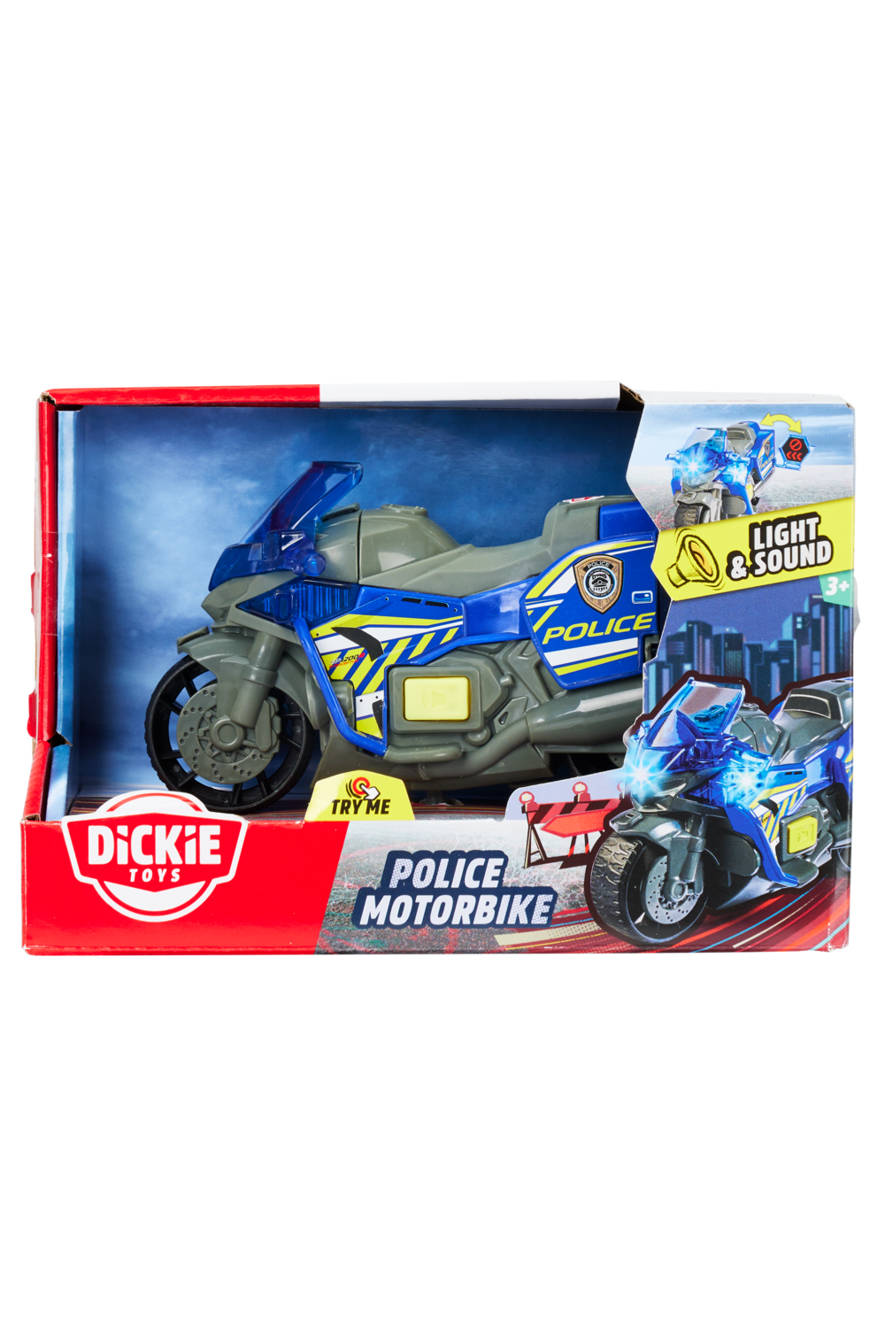 Always ready for action! Police officers don't always travel in patrol cars. This Dickie Toys police motorbike allows young children to immerse themselves in the world of a police officer and try their hand at maintaining law and order. This unique motorbike is the perfect gift for budding young police officers. It sports a futuristic, modern design that is guaranteed to keep little ones entertained. It also comes with eye-catching light and sound effects. The batteries (2x AAA) are included with the vehicle. For children aged 3 and above The large 15 cm design is perfect for small hands. The motorbike also features a blue light and siren that can be triggered by pressing a button on the vehicle, as well as a fold-out warning sign to provide a warning to other vehicles. The toy can be used to create all sorts of imaginary scenarios - the possibilities are endless!