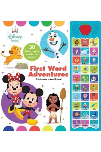 Join beloved Disney and Pixar characters as they explore the world, and discover first words along the way! Press 30 sound buttons to hear the words read aloud along with exciting sounds. Matching sight words to pictures and sounds is a first step to reading.