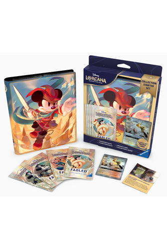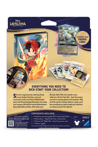 Everything you need to kick-start your collection! Start your magical journey collecting Disney Lorcana Trading Card Game cards and accessories! Inside, you'll find 4 Fabled Booster Packs with 48 spectacularly illustrated cards. Keep your treasures safe with the special Mickey Mouse- Brave Little Tailor portfolio, which holds up to 80 cards. Add a little extra sparkle to your collection with the Tinker Bell- Giant Fairy promo card and its stunning glimmer foil treatment. With all of this and the included collector's guide, you'll have everything you need to begin your adventure as a Disney Lorcana TCG collector! Contents include: 4 Fabled Booster Packs, 12 Randomized Cards Per Pack, 1 Mickey Mouse- Brave Little Tailor Card Portfolio, 1 Glimmer Foil Tinker Bell- Giant Fairy Promo Card, 1 Collector's Guide