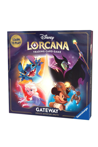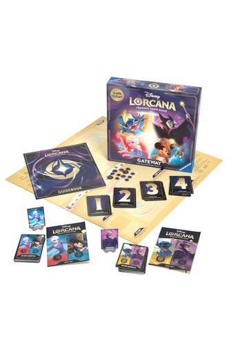 Enter a realm of fun and magic. Here, you play alongside beloved Disney characters in an exhilarating quest. This is a game for everyone, with all the thrills and excitement you'd expect from a timeless Disney adventure. Disney Lorcana Gateway is specially designed to be the best way to learn how to play. With everything you need contained in the box, you can jump right into your first quest, no experience required. The included guides help you learn as you play while building your game skills bit by bit. The realm of Lorcana is beckoning... come join the adventure! Contents: 2 Starting Decks (30 cards each), 4 Reward Packs (18 cards each), 30 Damage Counters, 2 Character Movers, 2 Character Bases, 1 Game Board, 1 Rulebook, 1 Guidebook, 2 Deck Tips Pamphlets.