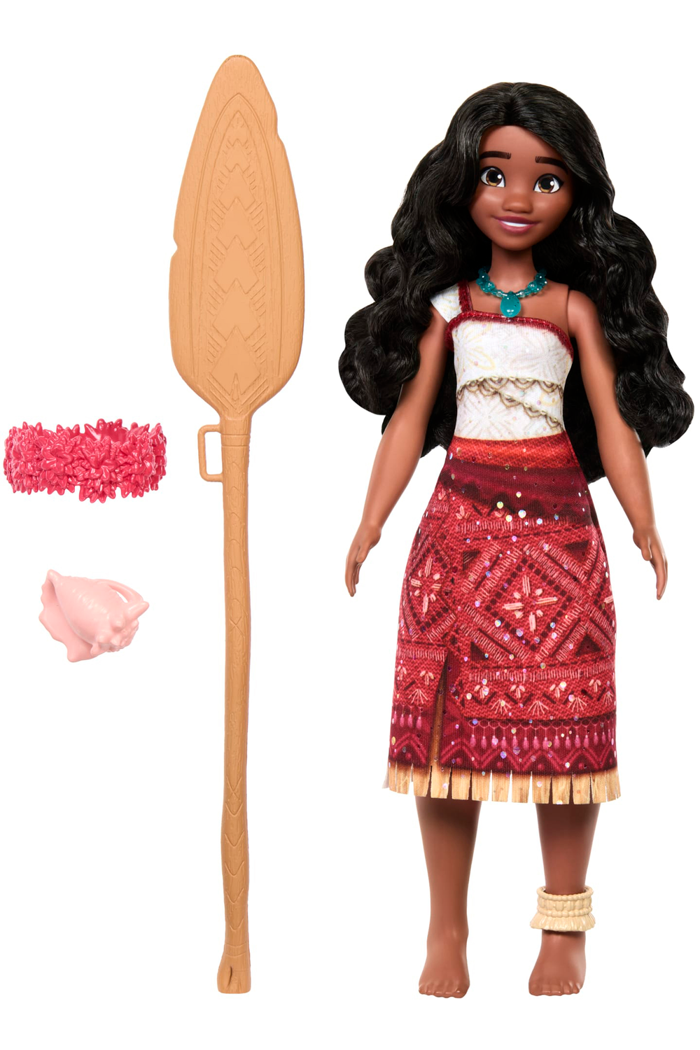 This Singing Adventure Moana Doll, inspired by Disney's Moana 2, the theatrical sequel to the original film, is ready to answer the ocean's call with courage, like the brave leader she is! Press her torso to hear a clip from the English version of "We're Back", the original song from the epic animated musical. The fashion doll bends at the arms, head and legs so kids can imagine her journeying over land and sea with her loyal crew. A wayfinder at heart, she comes dressed in her true-to-movie adventure outfit with beautiful, wavy hair and fun accessories. Kids and collectors, ages 3 years and older, can discover island adventures or recreate moments from the movie with Moana and the rest of her family and friends (each sold separately, subject to availability)!