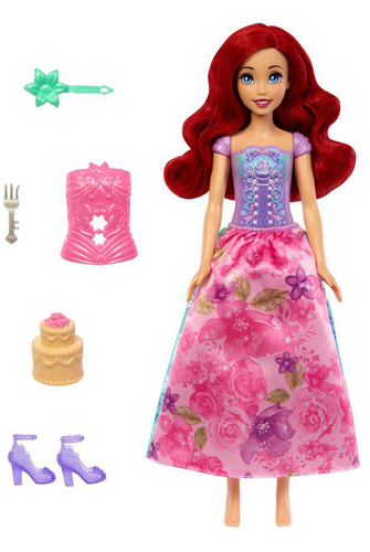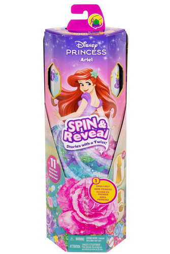Timeless Disney tales get a magical twist in this Disney Princess Spin & Reveal unboxing experience! First open the flower to reveal a play scene with mystery silhouettes. Next spin the package to find 5 mystery bags filled with 5 accessories and 5 stickers. The final reveal is a Princess fashion doll (Ariel, Rapunzel or Jasmine) in a beautiful floral outfit! A reversible skirt and snap-on bodice extend the fun, plus kids can decorate the play scene and imagine stories with it as a backdrop. Dolls cannot stand alone.