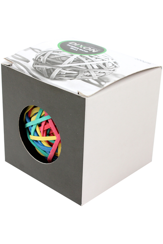 A box of Dixon's assorted coloured rubber bands in a ball. Packaging Dimensions: 7cm x 7cm x 7cm. Net weight: 200gm