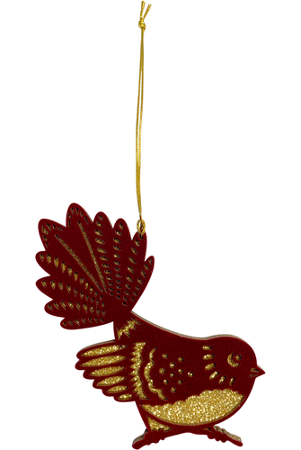 Add some kiwiana to your Christmas tree with this dark red wooden fantail decoration with gold glitter highlights, and a string to hang it.
