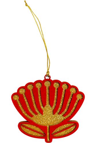 Add some kiwiana to your Christmas tree with this red wooden Pohutukawa decoration with gold glitter highlights, and a string to hang it.
